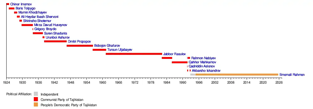 Below is the list of leaders of present-day Tajikistan since the establishment of Tajik ASSR in 1925.