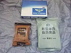 The People's Liberation Army's rations are of two types: Instant Meal Individual (three-item menu) and Self-Heating Individual (twelve-item menu) (Type 13 and 09). Sets of rations issued since 2018 consist of pre-packaged single-person meals sealed in hard plastic retort pouches.[40] A typical Chinese breakfast ration contains roughly 1,000 kcal (4,200 kJ) and includes a compressed food packet, an energy bar, an egg roll with pork, pickled mustard tuber, and a powdered beverage pack. Each Self-Heating Individual comes with an insulated flameless heater that is activated by water.[41]