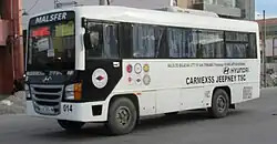 Used by the BEEP Rides public transport system in Metro Manila and Cebu City.[6] Some vehicles have their own air-conditioning system and are equipped with GPS tracking devices, dashboard cameras and CCTV cameras.[7][4] BEEP vehicles, depending on the model, have the capacity to seat 16 to 26 passengers at a time.[4][8][6] |
