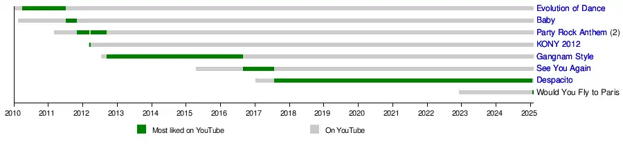 The music video for LMFAO's song "Party Rock Anthem" stood as the most-liked video on YouTube in 2012, with 1.56 million likes, until the video for Psy's "Gangnam Style" surpassed it in September that year with more than 1.57 million likes. Following this accomplishment, "Gangnam Style" entered the Guinness World Records book as the most-liked video on YouTube and on the Internet as of 2012. Psy's video remained the most-liked on YouTube for nearly four years until August 27, 2016, when Wiz Khalifa's "See You Again" featuring Charlie Puth surpassed it with 11.21 million likes. Less than a year later, on July 25, 2017, Luis Fonsi's "Despacito" music video featuring Daddy Yankee claimed the top spot with 16.01 million likes. Despacito became the first YouTube video to reach 50 million likes on October 23, 2022. "Despacito" remained the most-liked video for over seven years until January 27, 2025, when MrBeast's "Would You Fly to Paris for a Baguette?" video surpassed it with 55 million likes. It is also the most-liked video uploaded under the YouTube Shorts banner.