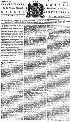 - ^ a b c d e f g h i j k l m n o p q r s t u v w x y z aa ab ac ad ae af ag ah ai aj ak al am an ao ap aq ar as at au av aw ax ay az ba bb bc bd be bf bg bh bi bj bk bl bm bn bo bp bq br bs bt bu bv bw bx by bz ca cb cc cd ce cf cg ch ci cj ck cl cm cn co cp cq cr cs ct cu cv cw cx cy cz da db dc dd de df dg dh di dj dk dl dm dn do dp dq dr ds dt "Eighteenth-Century American Newspapers in the Library of Congress: Pennsylvania". Library of Congress. Retrieved October 20, 2010.