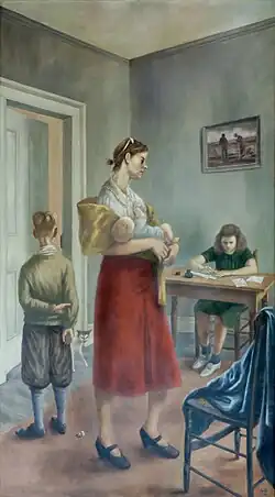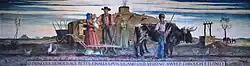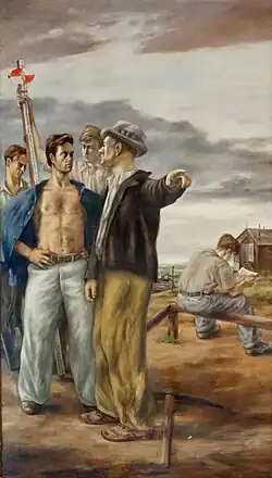 From 1934 to 1943, the Procurement Division of the United States Department of the Treasury commissioned murals in post office buildings across the country. Part of the New Deal, the stated objective of commissioning United States post office murals was to secure artwork that met high artistic standards[2] for public buildings, where it would be accessible to all people.[3] The murals were intended to boost the morale of the American people suffering from the effects of the Depression by depicting uplifting subjects the people knew and loved.[4] Murals produced through the Treasury Department's Section of Painting and Sculpture (1934–1943) were funded as a part of the cost of the construction of new post offices, with 1% of the cost set aside for artistic enhancements.[5] Murals were commissioned through competitions open to all artists in the United States.[6] Almost 850 artists were commissioned to paint 1,371 murals, most of which were installed in post offices;[5] 162 of the artists were women and three were African American.[5] The Treasury Relief Art Project (1935–1938), which provided artistic decoration for existing Federal buildings, produced a smaller number of post office murals.[2] TRAP was established with funds from the Works Progress Administration. The Section supervised the creative output of TRAP, and selected a master artist for each project. Assistants were then chosen by the artist from the rolls of the WPA Federal Art Project.[7]: 62–63