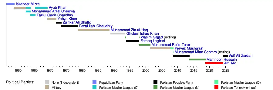 There have been a total of 13 presidents. The first president was Iskander Ali Mirza who assumed office on 23 March 1956. The current office holder is Asif Ali Zardari, who took office on 10 March 2024, following his victory in the 2024 election.[1]