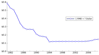 - ^ Exchange rates of 1981-1984: see "17-2 Average Exchange Rate of RMB Yuan against Main Convertible Currencies (Middle Rate)" China Statistical Yearbook 2001; exchange rates of 1985-2014: see China Statistical Yearbook 2015 / Financial Intermediation / 19-8 Reference Exchange Rate of Renminbi (Period Average); exchange rate of 2015: see Statistical Communiqué of the People's Republic of China on the 2015 National Economic and Social Development