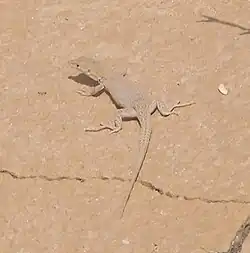 Gekkonidae is a large family of cosmopolitan lizards. It is a remarkably diverse family with upwards of a thousand species.[9] Bearing specially designed pads on their toes, geckos are granted effective adhesion to several surfaces. Vernacularly known as “بريعصي",[10] there are at least 10 species in Qatar.