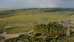 The density of rivers is highest in the mountain areas and lowest in Dobrudzha, the Danubian Plain and the Upper Thracian Plain.[1] There are two catchment basins: the Black Sea (57% of the territory and 42% of the rivers) and the Aegean Sea (43% of the territory and 58% of the rivers) basins.[1][3] The territory of Bulgaria is 110,994 km2, of which 63,270 km2 fall within the Black Sea catchment bason, divided between the Danube (49,950 km2) and Black Sea Coast drainage (13,320 km2), and 47,730 km2 fall within the Aegean Sea basin, divided between the Maritsa (34,166 km2), Mesta (2,767 km2) and Struma (10,797 km2) drainage.