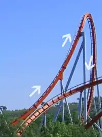 A vertical loop is one of the earliest and most common roller coaster inversions in existence. It is a continuous, upward-sloping section of track that eventually completes a 360-degree turn, inverting riders halfway into the element. It moves them slightly left or right of the starting point. They are ellipses in the shape of an oval or teardrop. Early roller coaster designs attempted to incorporate circular vertical loops, resulting in massive g-force that had dangerous effects on riders. The modern vertical loop was first implemented on Great American Revolution, which opened at Six Flags Magic Mountain in 1976.