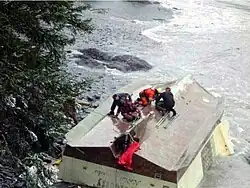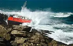 The fishing trawler ran aground south of Hentiesbaai, and 20 kilometres (12 mi) north of Wlotzbaken, Namibia, in stormy seas after breaking loose from her tow vessel.[46][47]