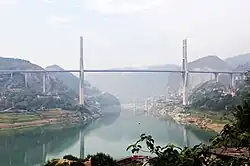 248 metres (814 ft)[8] | 580 metres (1,900 ft) | Cable-stayed | 2017 | Liutongxiang, Guizhou 27°04′43.3″N 106°24′03.2″E / 27.078694°N 106.400889°E |