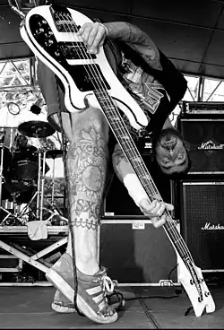 Various bands have played thrash metal at some point of their career. The genre evolved in the early 1980s from combining the drum beats of hardcore punk with the guitar style of the new wave of British heavy metal .[ 2] It emerged partially as a reaction to the more conventional and widely acceptable glam metal , a less aggressive, pop music-infused heavy metal subgenre which appeared simultaneously.[ 3]