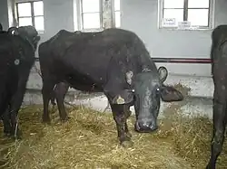 is black, black/brown or dark gray, has large black eyes, coiled horns, a wide rump, long tail, voluminous belly, deep broad chest, a short wide back often slightly dipped, well-developed udder suited to machine milking; is now rare in its homeland; exported to Romania and South America[8] | |