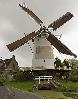 Grondzeiler | 1828 | The drainage mill was built in 1828. It ceased to work in 1884. The smock burnt down on 13 April 1954, leaving a single storey base used as a house. This was demolished on 19 September 2005 and a new two-storey octagonal house built on the site.[56] |