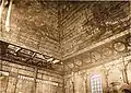 It consisted of a square (12 × 12 m) large main hall. The walls were 6 m high; it was 10.20 m to the highest point of the vault, and the floor was a few steps lower than the outer rooms. On the west side there was a vestibule and above it a gallery with arcades. A two-story corner pavilion stood to the right and left. The north and south sides were flanked by women's dreams. The main building had a three- story tent roof, with the upper step transitioning to an octagonal point. The corner pavilions had a two-story roof. Inside, four wooden pillars supported the vault; they divided the floor plan into nine equally sized fields. In the middle stood the bima; it was in the shape of an octagonal arbor with a canopy with a crown on the top. | ![]()