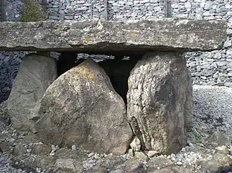 Bone and carbon material from Listoghil was carbon dated to around 3500 BC.[4] The human bones found there were a mixture of cremated, and un-cremated bones; the older, smaller tombs around it generally contain burnt bones. Extensive burning took place on the area of the site before the chamber was erected.