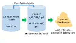 V2O5 gels are prepared using the ion-exchange method.[2] Vanadium (V) polymerizes aniline. Before synthesis of a hybrid battery, potentiometric titration of V2O5 gel with is carried out; this determines the amount of V(V) present in the gel. Aniline solution is slowly added onto the gel. The following procedure is demonstrated in Figure 3.
