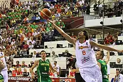 For the fourth post-independence Olympics, basketball captain Saulius Štombergas was given the honor to bear the Lithuanian flag during the opening ceremony.[103] The Olympic basketball for Lithuania started slowly, laboring to a victory against the African champions Angola 78–63, with their opponents shooting an excellent 52% from the three-point line. Lithuanian national team also had difficulties with Puerto Rico, depending on a high average of three-pointers to beat the NBA-heavy squad by 98–90. Then Lithuanians, in front of 12,000 spectators, achieved revenge against their Greek hosts, defeating them 98–76. The next match would be against the United States, which again featured major NBA stars such as Allen Iverson, Tim Duncan, and LeBron James, but had already been proven as faltering following a defeat to Puerto Rico. Lithuania managed to beat the United States 94–90, only the fourth defeat by the Americans in the Olympic stage.[104] Jasikevičius, who had lost a possible buzzer beater against the Dream Team four years before, managed to score 28 points, including a decisive 10-point barrage in 69 seconds that gave Lithuania the lead in the final minutes.[105] While the fifth game, versus Australia, was not significant for the group standings as the Lithuanians had already secured the first spot in the group, the Lithuanians still won 100–85, maintaining their good run.[106]