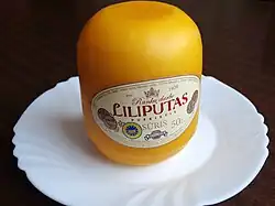 The traditional Lithuanian curd cheese Lietuviškas varškės sūris has been registered as a Protected Geographical Indication (PGI) in the EU and UK.[21] The most popular way of eating Lithuanian non-fermented white cheese is with fresh honey; it can also be cooked with spices and enjoyed with tea. Food historians estimate that the curd cheese was known for 4-6 thousands of years.[22] Lithuanians started fermenting hard cheese around the 16th century in the region of Samogitia. Across Samogitian borders, this cheese was known as Lithuanian cheese. Historically there were not many varieties of cheese in Lithuania, due to low levels of lactose intolerance. Milk products were usually consumed fresh, or slightly fermented. Semi-hard cheese Liliputas in 2015 was registered as an EU Protected Geographical Indication (PGI).[23] Hard cheese Džiugas ripens for at least 12 months, is popular among gourmets and being used as to flavour recipes. Džiugas in 2019 was registered as a Protected Geographical Indication. In the interwar period Šėta was famous for its cheese, which was made in sūrinė (cheese house). Small family farms throughout Lithuania also producing various types of artisan cheeses being sold in eco and farmer markets, restaurants.