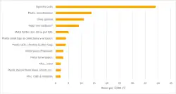 The main categories of litter materials identified in the audit included cigarette butts, paper and cardboard, metal, glass, plastic and organic waste.[55] The most frequently found item nationally was cigarette butts. 39 butts were recorded per 1,000 m2.[56] Disposable nappies, which were included in "miscellaneous" items, made up the largest contribution to the estimated national litter volumes, recording 1.50 litres of volume per 1,000 m2.[57] Glass beer bottles made up the largest contribution to the national litter weights, recording 0.12 kg of weight per 1,000 m2.[58]