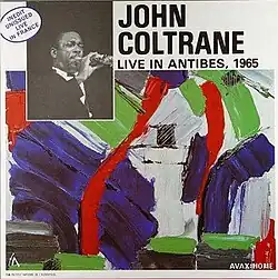 Coltrane and his quartet then embarked on a one-week tour of Europe, playing at the sixth International Jazz Festival at Juan-les-Pins in Antibes, France on July 26 and 27, followed by a concert at the Salle Pleyel in Paris on July 28, and winding up with a performance at a jazz festival in Comblain-la-Tour, Belgium on August 1.[2] The July 26 concert, on which Coltrane shared billing with Jimmy McGriff, featured a live performance of A Love Supreme, a 48-minute version which took up the entire program. (A recording of this concert appears on the 2002 Deluxe Edition[3] and the 2015 Super Deluxe Edition[4] of A Love Supreme.) The following day, at the request of the festival, Coltrane performed material that was more familiar to the audience.[5] The versions of "Naima", "Blue Valse" and "My Favorite Things" on Live in Antibes were recorded that day.[6] The remaining tracks, "Impressions" and "Afro-Blue", were recorded at the July 28 concert in Paris.[7] ("Blue Valse" is actually a quartet version of "Ascension", and was mis-titled due to a miscommunication with concert personnel.[7])