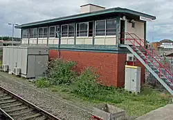 The station was also remodelled once more and resignalled at this time, and in 1985 a new power signal box was commissioned at the western end,[2] which now controls the station area and junctions along with the main line between Colwyn Bay and Conwy and the northern end of the Conwy Valley branch (using the electric token system). The token machine for the branch is located at the station rather than in the signal box for operational convenience, allowing drivers to collect or return their token (with the cooperation of the signaller) whilst station work is undertaken, rather than having to make an additional stop at the box to make the exchange.