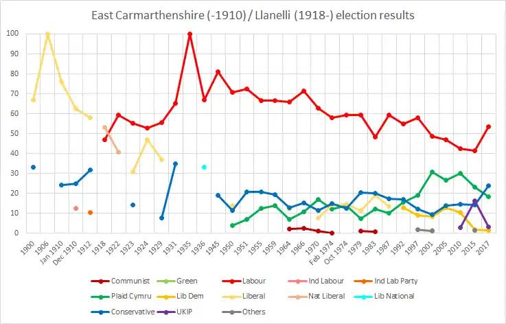 Llanelli has traditionally been an ultra-safe Labour seat, with a Labour MP representing the constituency since 1922. It was represented by one-time deputy leader of the Labour Party, Jim Griffiths, from 1936 until his retirement in 1970. In recent years however Labour's majority had been somewhat eroded by Plaid Cymru, who as of 2021 have won the equivalent seat in the Senedd in two of the six Senedd elections to date. At the 2015 general election, however, the Labour majority increased once again and in 2017 it increased further to nearly 30% with the Conservatives replacing Plaid Cymru in second place. At the 2019 general election, there was a swing of 8.8% from Labour to Conservative but the latter's vote collapsed in 2024, allowing Reform UK to take second place and reducing Labour's majority to 1,504 (3.7%).