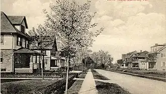 The 1895 subdivision development in Llanerch was one of the Township's first, with twelve dwellings constructed by architects Robert G. Kennedy and Frank A. Hays who both resided in the neighborhood.[4] Frank A. Hays left the firm Kennedy, Hays & Kelsey shortly after completing much of the design work of Llanerch, becoming a professor of ink and rendering at the University of Pennsylvania School of Architecture.[11] The two purchased 200 acres of "beautiful rolling ground" from businessman Henry Albertson, with the highest point of the site allowing a view of Philadelphia City Hall.[12] Llanerch was described as being built upon a high knoll and as an upland, that was "high, dry, cool" with access to freshwater from the Springfield Water Company.[13][14][15] The new subdivision was planned with "Telford roads, granolithic pavements, under drains, [and] electric lights" with a minimum lot size of 50 by 150 feet.[16] The streets were laid out to magnify the distance between one home and next, offering focal points and a sense of destination between houses.[12] Llanerch was the first subdivision in Haverford to use deed restrictions, setbacks and minimum home costs.[5]