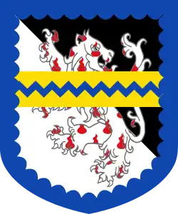 | Arms | Per bend Sable and Gules a lion rampant regardant Argent goutté of the second surmounted of a fess Or charged with a barrulet dancette Azure a bordure invected of the fourth. |