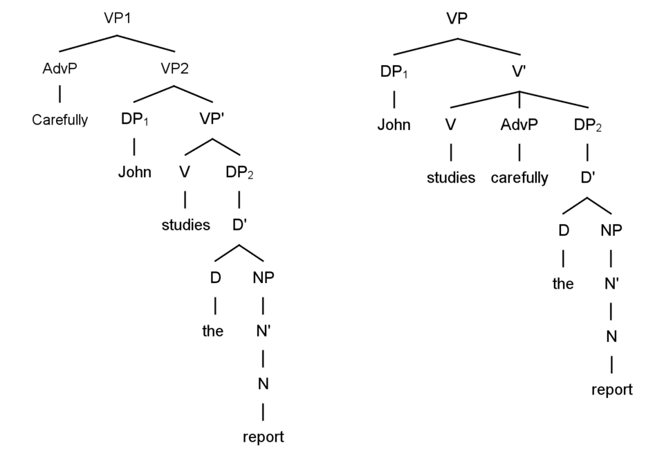 In the tree for sentence (1a), the verb, studies, is the Head of the VP projection, the DPTHEME, the report, is projected onto the Complement position (as sister to the head V), and the DPAGENT , John, is projected onto the Specifier (as sister to V'). In this way, (1a) satisfies Locality of Selection as both arguments are projected within the projection of the head that introduces them. The adverb phrase, AdvP carefully attaches as an unselected adjunct to VP; structurally this means that it is outside of the local projection of V as it is sister to and dominated by VP. In contrast, in the tree for sentence (1b), the introduction of the AdvP carefully as sister to the verb study violates Locality of Selection; this is because the lexical entry of the verb study does not select an AdvP, so the latter cannot be introduced in the local projection of the verb.