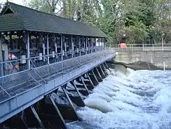 Lock Island is an island in the River Thames in England connected to Shepperton Lock, near Shepperton. Facing the attached by lock-gate bridge mainland is a hedge-lined lawn hosting a café, below and above zones of free short-stay moorings. The Thames River Police have a station on the island. Shepperton Canoe Club and Weybridge Mariners' Boat Club face part of the Weybridge side. The island is connected to Hamhaugh Island by a walkway across the main weir, in turn having a closed-access weir to Hamm Court, Addlestone.