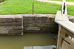 The 1828 design originally filled the lock chamber through the use of culverts in the lock masonry. The wicket, i.e. large paddle valve, hidden in the masonry recess where the upper gate fit in, would be opened, and water would flow through the lock masonry to three openings in the lock chamber. Both sides of the lock had these, so there would be a total of 2 wickets, and 6 openings. The upper gate is above the breast wall.[24][25] Most of the wicket openings in the upper gate recess have been closed with masonry, but one wicket at Violettes Lock is still intact as of 2013 (see photo). Note that modern replacement gates in locks 1–23, have the wickets in the gates, since the original wickets in the lock masonry are inoperable. This system of routing water through the masonry was abandoned due to the tendency for debris to clog the opening.[26]