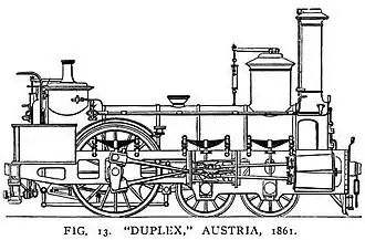 Locomotive Duplex was an experimental 4-cylinder steam locomotive designed by John Haswell of the Austrian State Railway Works at Vienna and built in 1861. It was exhibited at the 1862 International Exhibition and was then used on the line from Prague to Podmokly (part of Děčín today) where it worked till 1900.[1] Prague was the capital of Bohemia, at that time part of the Austro-Hungarian Empire.