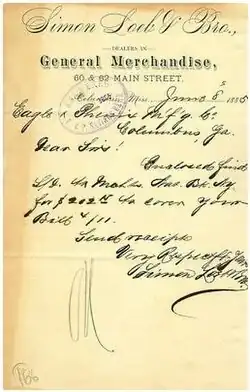 In 1874, he created the store with his younger brother, Julius. They sold dry goods, clothing, and shoes. Although Simon arrived in Columbus with little money, he and his brother eventually became successful merchants.[2]