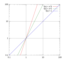A log–log plot of y = x (blue), y = x2 (green), and y = x3 (red).