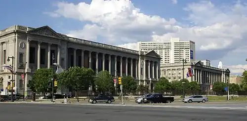 Construction began in 1917 on a plan to connect Center City with Fairmount Park which later became a segment of Benjamin Franklin Parkway.[8] It was designed by Jacques Gréber, a French landscape architect who converted Logan Square into a circle similar to the oval of the Place de la Concorde in Paris.[9] Philadelphia even modeled its Free Library and Family Court Building after the twin buildings of the Hôtel de Crillon and the Hôtel de la Marine in Paris.