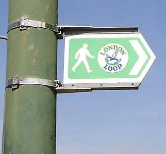 The London Outer Orbital Path—more usually the "London LOOP"—is a 150-mile (242 km) signed walk along public footpaths,[1] and through parks, woods and fields around the edge of Outer London, England, described as "the M25 for walkers". The walk begins at Erith on the south bank of the River Thames and passes clockwise through Crayford, Petts Wood, Coulsdon, Banstead, Ewell, Kingston upon Thames, Uxbridge, Elstree, Cockfosters, Chingford, Chigwell, Grange Hill and Upminster Bridge before ending at Purfleet, almost directly across the Thames from its starting point. Between these settlements the route passes through green buffers and some of the highest points in Greater London.
