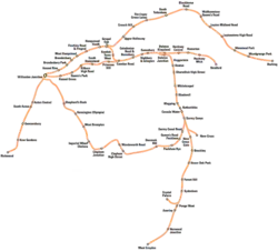 The proposal from Barren was for several overlapping services mainly using the North London line, generally at 20-minute intervals.[5] The suggested routes followed the original North London line service from Broad Street to Richmond, new services from Barking to Clapham Junction, and a third service from Ealing Broadway to North Woolwich. Nothing came of these proposals.