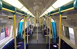 The trains were originally delivered with seats with a mauve and grey moquette. They formed the letter J for Jubilee (the Northern line's moquette formed the letter N). This was replaced in November 2005 with the new dark blue Tube Lines moquette with multi-coloured and multi-size hollow squares, introduced at the same time on the 1973 and 1995 stock. At the same time, the purple armrests were repainted blue to match the new seats.