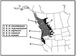 - The 'coastal' or 'western' subspecies (A. m. macrodactylum) lineage extends north from northeastern California, across the Klamath Siskiyou Range, through the Willamette Valley, along the coastal mountain ranges, including the Cascade Mountains, and continuing north through British Columbia and up into Alaska.[11]