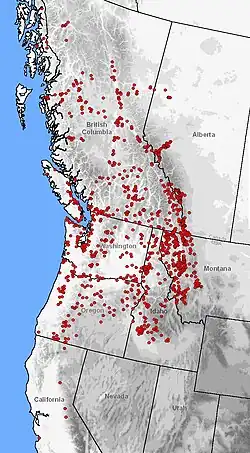 | Distribution of A. macrodactylum (red dots) in western North America | |