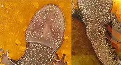 As larvae metamorphose, they develop digits from their limb bud protrusions. A fully metamorphosed long-toed salamander has four digits on the front limbs and five digits on the rear limbs.[31] Its head is longer than it is wide, and the long outer fourth toe on the hind limb of mature larvae and adults distinguishes this species from others and is also the etymological origin of its specific epithet: macrodactylum (Greek makros = long and daktylos = toe).[32] The adult skin has a dark brown, dark grey, to black background with a yellow, green, or dull red blotchy stripe with dots and spots along the sides. Underneath the limbs, head, and body the salamander is white, pinkish, to brown with larger flecks of white and smaller flecks of yellow. Adults are typically 3.8–7.6 cm (1.5–3.0 in) long.[26][20]