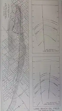 The Long Beach Oil Field is a large oil field underneath the cities of Long Beach and Signal Hill, California, in the United States. Discovered in 1921, the field was enormously productive in the 1920s, with hundreds of oil derricks covering Signal Hill and adjacent parts of Long Beach; largely due to the huge output of this field, the Los Angeles Basin produced one-fifth of the nation's oil supply during the early 1920s. In 1923 alone the field produced over 68 million barrels of oil, and in barrels produced by surface area, the field was the world's richest. During the early stages of the field's development, unlike most oil fields, land was leased by the square inch instead of by the acre.[1][2][3] The field is eighth-largest by cumulative production in California, and although now largely depleted, still officially retains around 5 million barrels of recoverable oil and has produced 963 million out of 3,600 million barrels of original oil in place.[4] 294 wells remained in operation as of the beginning of 2008, and in 2008 the field reported production of over 1.5 million barrels of oil.[5] The field is currently run entirely by small independent oil companies, with the largest operator in 2009 being Signal Hill Petroleum, Inc.[6][7]