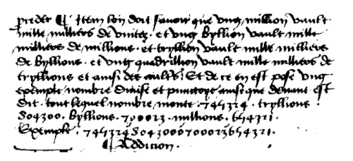 | 1475 | French mathematician Jehan Adam, writing in Middle French, recorded the words bymillion and trimillion as meaning 1012 and 1018 respectively in a manuscript Traicté en arismetique pour la practique par gectouers, now held in the Bibliothèque Sainte-Geneviève in Paris.[21][22][23]