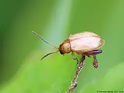 The species is yellowish-white coloured, and has orange legs and antennae.[1]
