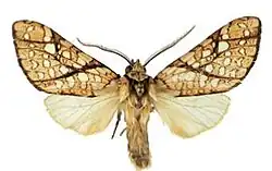 The length of the forewings is about 18 mm. The ground colour is yellow with white spot bands. The basal band has one white spot highlighted with brown. The postbasal, antemedian, median, postmedian and subterminal bands are formed by rounded white spots intercalating between veins. The wing is crossed by two narrow brown transverse lines. The fringe is brown. The hindwing is white and semi-translucent. The anal margin is more densely scaled with yellow.[1]