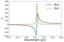 Lorentz oscillator model. The real (blue solid line) and imaginary (orange dashed line) components of relative permittivity are plotted for a single oscillator model with parameters (12.6 μm),, , and . These parameters approximate hexagonal silicon carbide.[6]