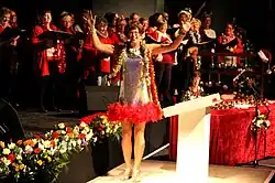 Lorraine Bowen's Polyester Fiesta show celebrates polyester and has four models, a scientist and a wardrobe mistress. Bowen acts as hostess, model and sings down the catwalk. Bowen has been a collector of vintage polyester outfits since visiting jumble sales as a girl and the collection has been featured on BBC One's The One Show[5] and BBC Radio 4's Woman's Hour.[6]