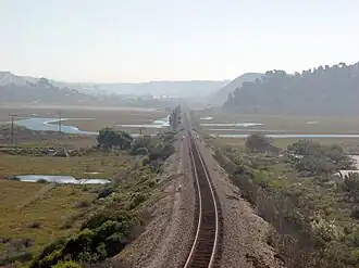 Originally, the railroad tracks travelled straight from Sorrento Valley on the eastern side of the Lagoon and ran parallel north of what is now Carmel Valley Road, therefore the impact on the tidal circulation and the mouth was much smaller than for the other lagoons nearby.[11] However, in 1925, the Santa Fe Railroad built a single-track roadbed causeway embankment down the center of the lagoon for its Surf Line, which still is in use today on a daily basis by the Coaster and Pacific Surfliner as well as BNSF Railway freight trains. This embankment severely restricted the normal historical lagoon drainage for the first time, and changed the tidal flow and current pattern.[1] The four original wooden trestle bridges crossing the lagoon (three over the water[7] and one over the McGonigle Road) were replaced between 2015 and 2017 with new concrete bridges to help modernize the railroad traffic to and from San Diego. Even though the bridges were replaced, this area was not double-tracked because it is possible that these tracks will eventually be bypassed by a two-track tunnel underneath Del Mar.[18]
