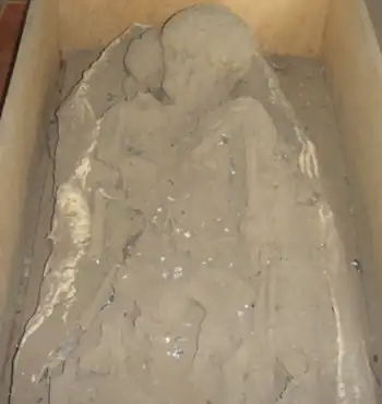 The first anatomical part discovered was part of the skull which was placed face-down, the ribs, shoulder, scapulae and phalanxes were associated with the humerus and ulna – left side radius on the left side of the head. Lower limb of the skeletal remains were on the right side of the skull, the femurs below and the tibia - fibulae above, the pelvis and vertebrae residues were below the skull.
