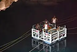 The site was created centuries ago as a result of tectonic fractures when caves collapsed, forming a bowl-shaped depression which subsequently filled with water.[3] Initially, the cave was used by the indigenous Taíno Indians for religious rituals and fertility rites. The Taíno were the first inhabitants of the Hispaniola island. The three main lakes are called "Lago de Azufre" (discovered in 1916), "La Nevera" and "El Lago de las Damas".[4] Some of the lakes also have openings on the outside.[5] A staircase carved into the rock gives access to the first cave while a boat takes visitors across the second lake to give access to a fourth lake called "Los Zaramagullones". This lake is not considered one of the three "eyes" or main lakes, as it has an opening to the outside.