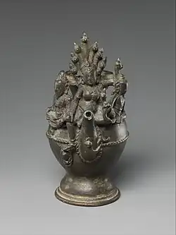 In West Bengal and parts of Bangladesh, the term bôdnā (Bengali: বদনা) describes spouted (teapot-like) vessels, and the vessels used for puja are called ghôt or ghôti, while lotā is used for cleansing mugs.[8] In Odisha, vessels without the spout is also known as lota, while spout vessel is known as Jeri, used for prayer rituals and serving liquor.[9][3] They are also known as Karwa, Jharis and Achaman Jharis (utensils with spouts) in Hindi Belt and Gujarat in northern and western India, used for prayer rituals.[10] It is also known as Mooku sombu and Pal Kindi used as milk feeder for babies in southern parts of India. In Nepal, it is known as Karuwa which is used for religious rituals, serving water and liquor.[4]
